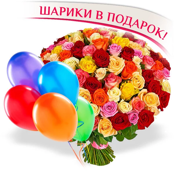 101 роза: роза красная - 101 шт. (высота розы - 50 см), 5 разноцветных шара (красный, желтый, синий, зеленый, фиолетовый).